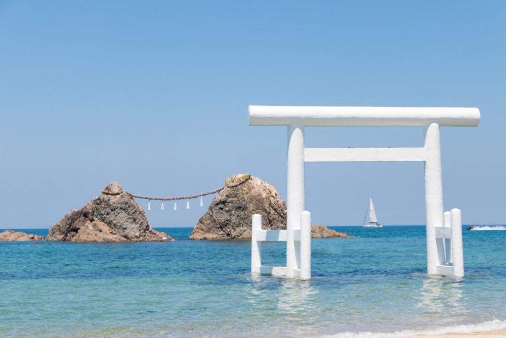 桜井二見ヶ浦の夫婦岩は、糸島を代表する絶景スポットで、海中に立つ二つの岩が白い注連縄で結ばれています。
